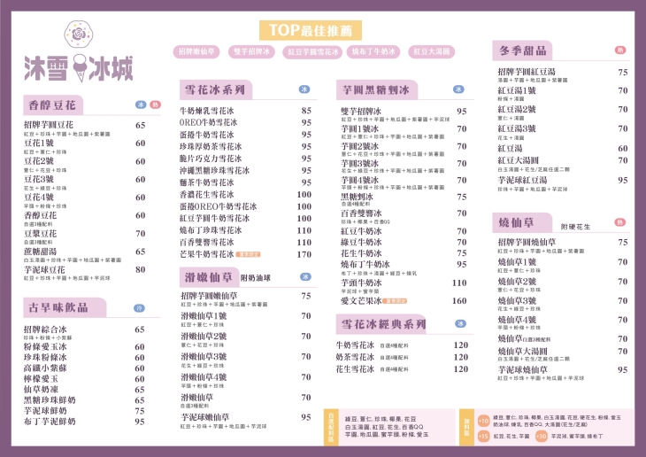 走在街上,一抬頭就會看到那塊醒目紫色招牌,「沐雪冰城」幾個大字超吸睛。大片落地玻璃將店內明亮空間一覽無遺,木紋吧台搭配黃色燈光,給人溫暖又清爽的第一印象。走近一看,冷藏台裡整齊擺著各式配料,色澤飽滿、看得出相當講究。店內多款超人氣甜品好吃又好拍,基底可自由搭配,繽紛配料堆成小山,端上桌就讓人忍不住先拍一輪再開動。想在炎炎夏日消暑、或冬天來一碗熱甜湯暖胃,來沐雪冰城就對了。