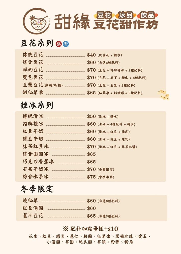 甜緣冰品豆花店以每日現做的手工傳統豆花為核心,用最樸實的方式呈現最真實的風味。豆花質地細嫩、入口即化,每一口都能感受到手工製作的溫度與用心。選用安心實在的用料,不追求複雜堆疊,而是讓香氣與口感自然展現,吃起來格外舒服順口。店名「甜緣」象徵著甜甜的緣份,希望藉由每一碗精心準備的甜品,把這份溫暖傳遞給每位來訪的客人,用美味牽起你我的小小緣分。這裡的甜,不只是味道,更是一份真誠的心意。
