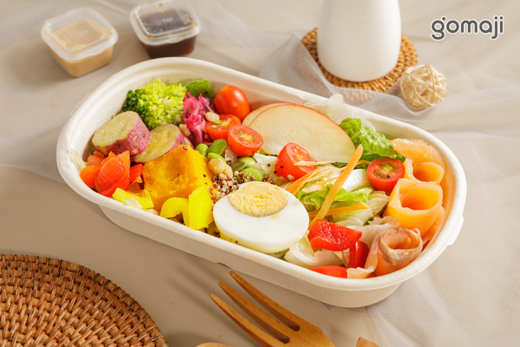 超豐富的海陸集合沙拉,將滿滿蔬菜、水果與高蛋白一次裝進盒裡,口感豐富又有飽足感。主角選用嫩口舒肥雞胸,加上捲成花朵的煙燻鮭魚,旁邊再點綴晶亮魚卵與半顆水煮蛋,海味與肉香一次滿足。最後淋上清爽沙拉醬,每一口都能吃到清脆與Q彈交織的層次,是想補充蛋白質又不想太有負擔時的完美主餐選擇。