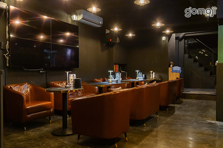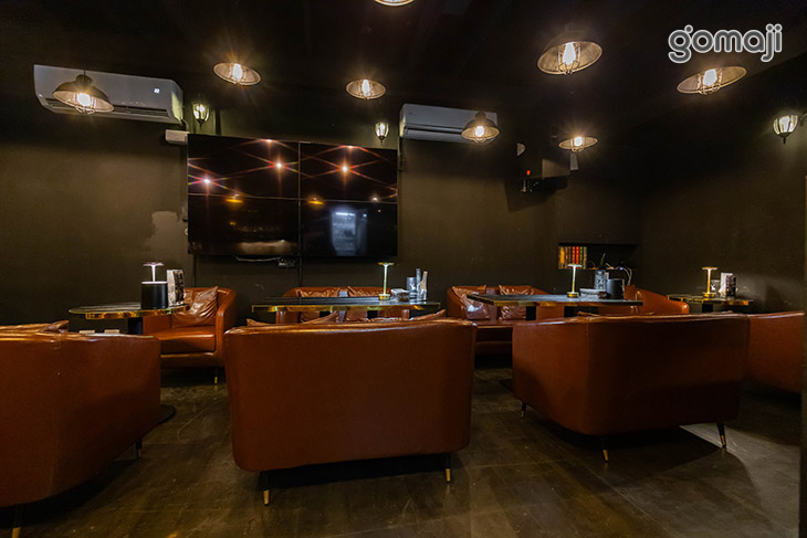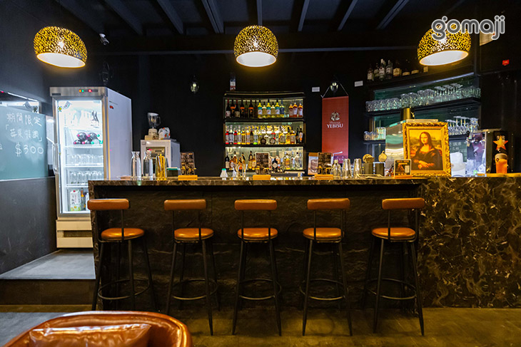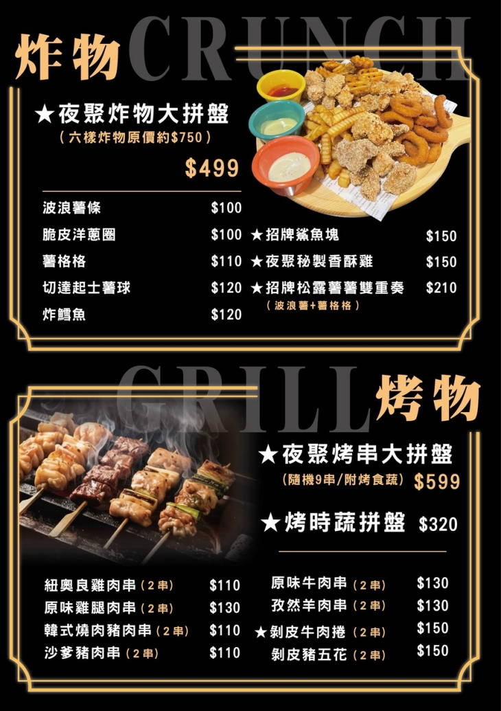 「夜聚酒酒」隱身在街角大樓一隅,藍色招牌在夜裡微微發光,帶著一點神秘與優雅。推開門,映入眼簾的是深色系空間與暖黃燈光,皮質沙發成排而立,坐下就忍不住想把一天的疲憊都放在椅背上;寬敞的吧檯整齊擺放著各式器具與小物,搭配現炸點心、串烤,無論是想簡單墊墊胃,或是慢慢聊天配點小點心,都很剛好。想呼吸新鮮空氣,還能走到戶外露天區,陽傘、燈串與綠意圍繞,像多了一個城市裡的小陽台。三五好友聚會、同事慶祝、情侶約會,都能在這裡慢慢談天、放鬆心情,為忙碌的一天劃下舒服的句點。