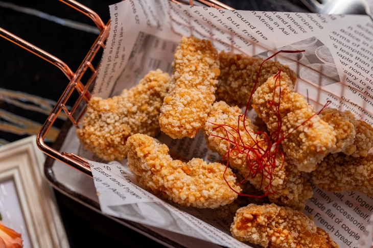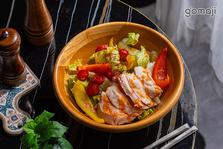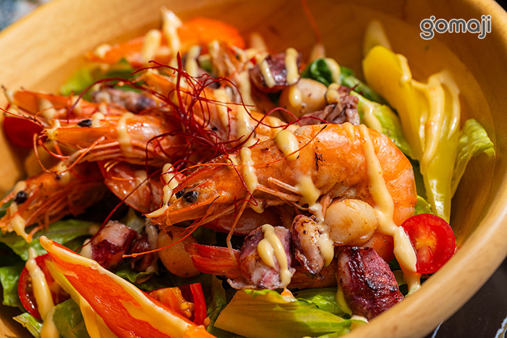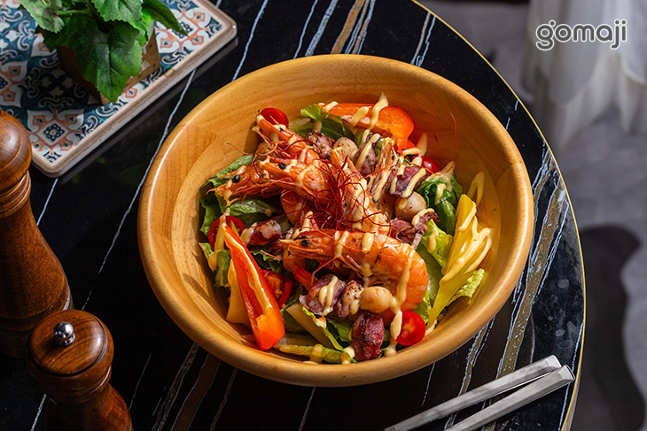 鹹蛋黃海鮮沙拉一上桌就是繽紛又澎湃的畫面,木碗裡鋪滿爽脆生菜,上頭大方放入各式海味配料,再淋上香濃鹹蛋黃醬,金黃色澤看了就食指大動。每一口都能嚐到生菜的清甜與海鮮的鮮美,伴隨鹹蛋黃特有的沙沙口感與濃郁香氣,在嘴裡交織出鹹香又帶點奶油感的迷人滋味。各式海鮮搭配爽口蔬菜,吃起來豐富有層次又不顯負擔。無論是當作開胃前菜,或是想來一份清爽卻有飽足感的主食,這道鹹蛋黃海鮮沙拉都十分適合,是愛海鮮、又想吃得清爽的人不能錯過的一道精緻選擇。