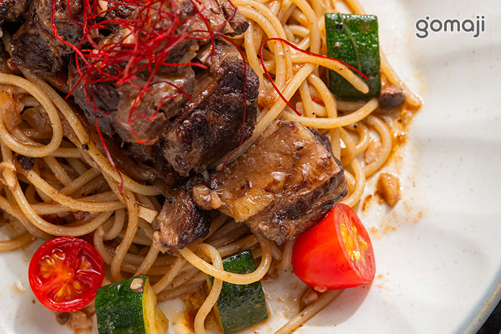 將經長時間燉煮的牛肋搭配義大利麵,是一道一上桌就充滿香氣的主角料理。選用帶筋帶油花的牛肋條,先煎至表面焦香,再以紅酒與蔬菜慢火燉煮,肉質軟嫩入味、輕壓就能分離,卻仍保有紮實嚼感。麵條吸附滿滿醬汁,帶著牛肉與蔬菜交織出的微酸甘甜,每一口都香濃而不膩。盤中再以時蔬點綴,增添清爽層次與視覺亮點。無論單點享用,或搭配其他餐點一起分享,都是喜歡牛肉與義大利麵饕客不能錯過的一道精緻主餐。