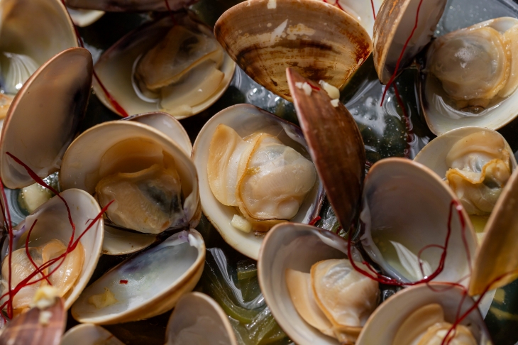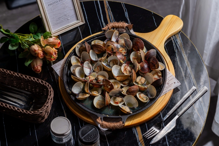「奶油大蛤蠣」一上桌就氣勢十足,整盤蛤蠣鋪滿鑄鐵盤面,顆顆飽滿圓潤、殼口微開,散發誘人海潮香。以奶油小火慢煎,融入香料的香氣,湯汁呈現金黃乳白色,濃郁卻不厚重。夾起一顆放入口中,蛤蠣肉鮮甜多汁、彈嫩飽口,咬下去還能感受到海水般的鹹香在舌尖綻開,和滑順奶油完美交疊,讓人忍不住一口接一口,是海鮮愛好者必點的療癒料理。