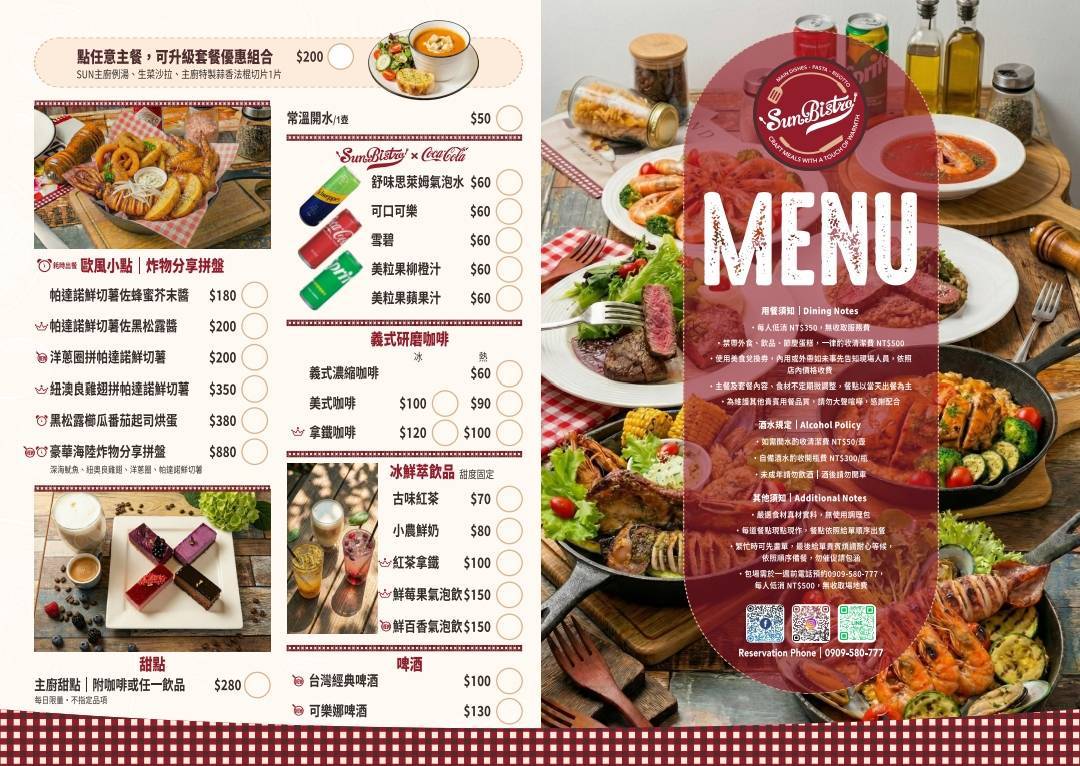 Sun Bistro 歐陸餐館每道料理都展現細膩的風味與溫暖的人情味。店內裝潢溫馨,柔和的燈光搭配木質家具,讓人一踏進來就感受到悠閒愜意的用餐氛圍。這裡的餐點特別講究食材,每一口都能感受到義式料理的精髓,簡直是極致享受。無論是想要約會、聚餐,還是單純想找個地方放鬆,Sun Bistro 小餐館都是個讓人流連忘返的好選擇!