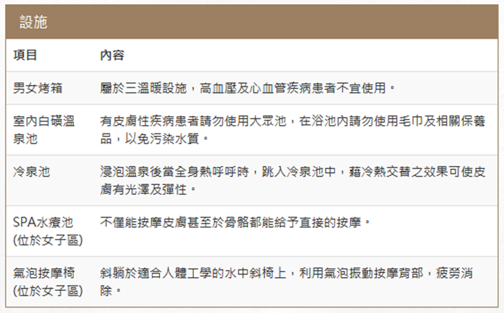 以素潔的米白為室內基調,您可依不同湯池、溫度以及水療方式,選擇您的偏好,讓身心完全放鬆!