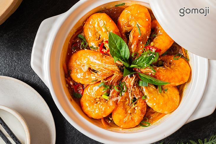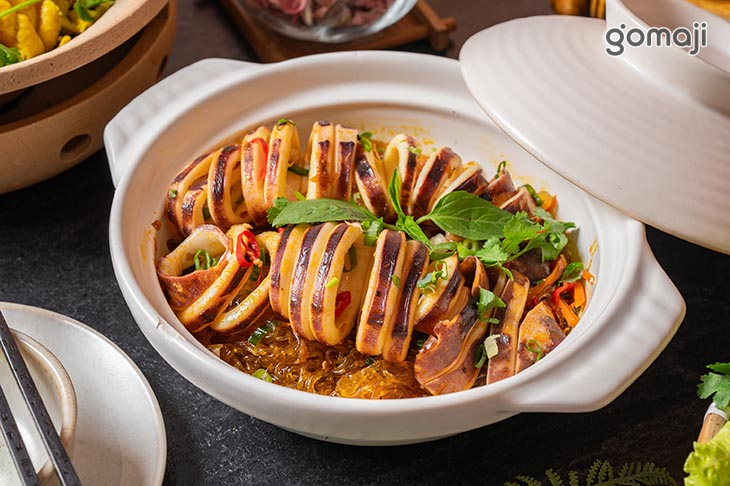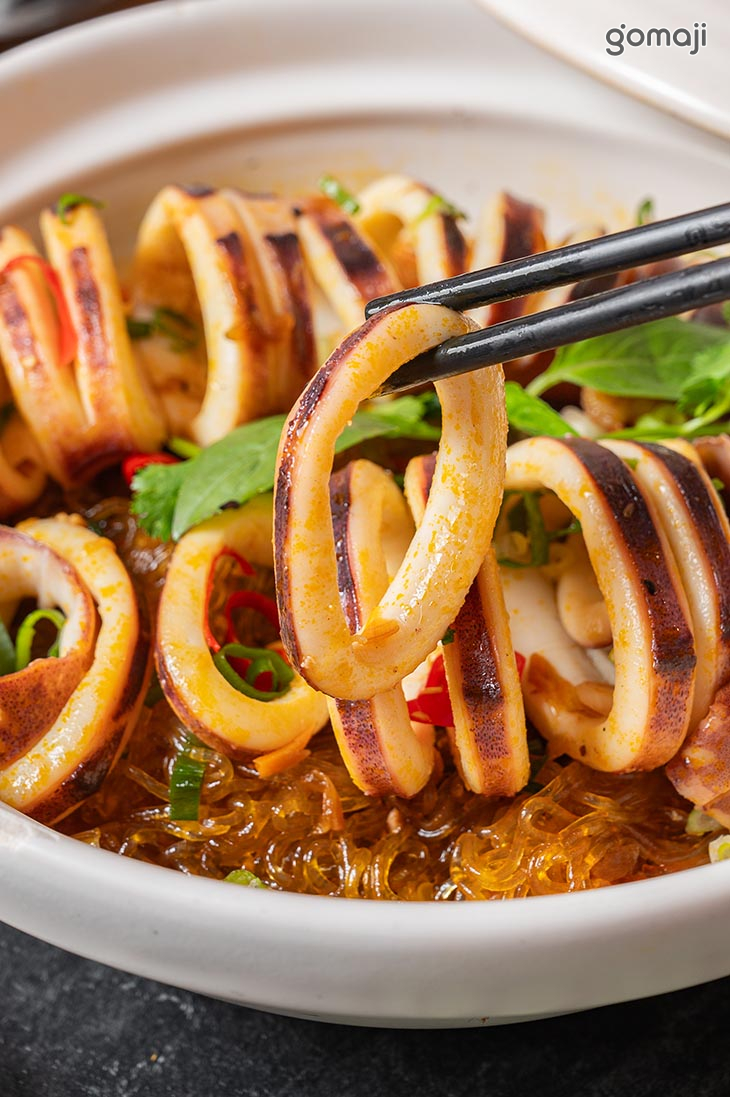 以鮮甜海味搭配吸滿湯汁的冬粉,呈現出溫潤濃郁又帶有南洋香氣的特色。這道料理以砂鍋慢火燉煮,讓食材在加熱過程中充分融合,香氣層層釋放,一上桌便能聞到濃郁誘人的海鮮與蒜香氣息。主角選用新鮮飽滿的魷魚,口感彈嫩有嚼勁,經過調味後與冬粉一同燉煮,使海鮮的鮮甜逐漸滲入湯汁之中。透明滑順的冬粉吸飽醬汁與海味精華,色澤晶亮、口感Q彈,每一口都帶有濃郁卻不厚重的鹹香滋味。