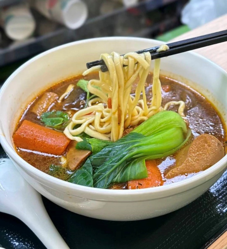 以新鮮番茄細火熬煮湯頭,融合紅燒香氣與自然酸甜,湯色紅潤、層次飽滿,入口溫潤順喉。特製素牛肉口感紮實入味,搭配麵條、紅蘿蔔,味道濃香不膩。蛋素設計保留經典紅燒牛肉麵的厚實風味,同時少油清爽,讓人吃得滿足又無負擔。