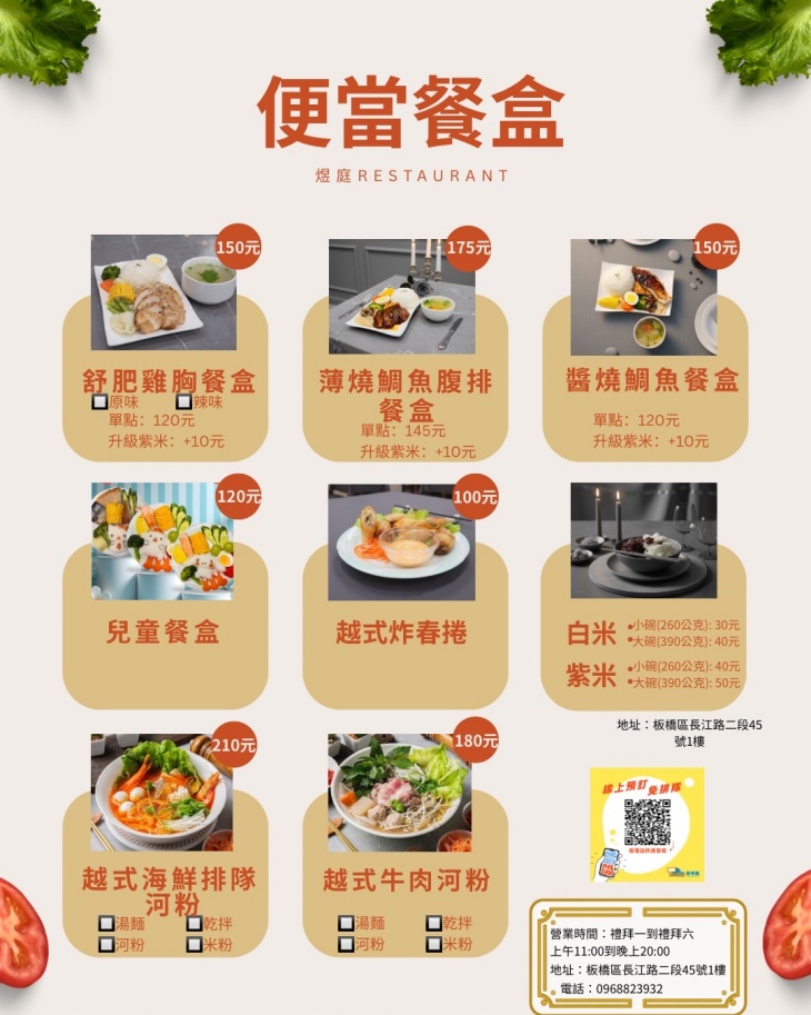煜庭 健康便當餐盒(板橋店)主打「吃得健康,也要吃得開心」,餐點以少油、少鹽、原型食物為核心,選用新鮮食材,搭配均衡的蛋白質與豐富蔬菜,讓忙碌的上班族、健身族、外食族,也能輕鬆吃到營養均衡的一餐。主餐部分提供多樣化選擇,像是檸檬椒鹽鮭魚、越式排骨、香辣嫩雞腿等,不乾柴、不油膩,吃得出用心。配菜則依季節調整,強調天然調味,讓蔬菜也能好吃不無聊,幫你顧好健康、補滿能量。.jpg)