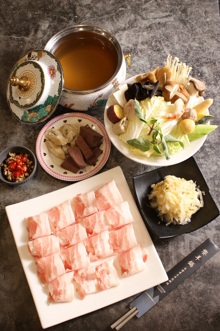 ▼酸菜鴨血大腸鍋底+黑毛豬梅花鍋