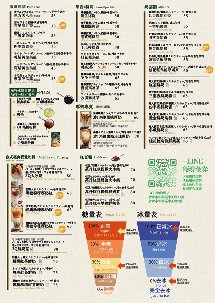 GD中和一號店,黃金夢Golden Dream的品牌理念核心堅持「好喝、平價、人人喝得起」。打造高品質卻平價的飲品,成為顧客日常幸福感的一部分。茶葉都是選用通過 SGS 認證的好茶、每季檢驗,使用古法紅糖熬煮,風味獨特。古法熬煮冬瓜塊,不含香精。不添加冰塊,讓您喝的每一口都是最好的味道。
