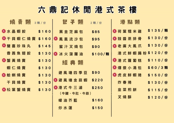 空間明亮又寬敞,座位之間不擁擠,不管是朋友相約聊天、全家人聚餐,或是平日中午想吃點不一樣的,都很合適。店內裝潢帶著濃濃港味,氣氛熱鬧卻不吵雜。餐點選擇超豐富,從經典港點到熱炒主食通通有。燒賣、蝦餃皮薄餡多,冰火菠蘿油鬆軟不甜膩,熱熱吃特別療癒。想吃飽一點的,撈麵、炒飯也都非常有水準,鑊氣香氣一上桌就讓人食指大動。這裡不是走浮誇路線,而是那種會讓人想一來再來的實在好店。不管是熟門熟路的港點控,還是第一次接觸港式茶樓,都能在六鼎記找到屬於自己的那一道心頭好。
