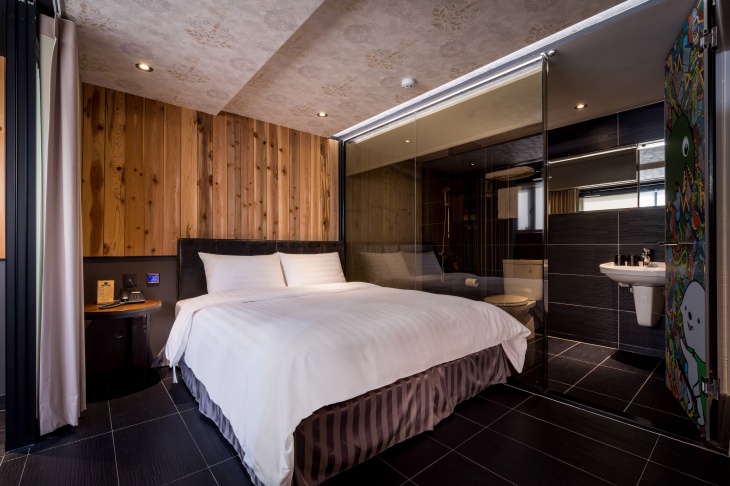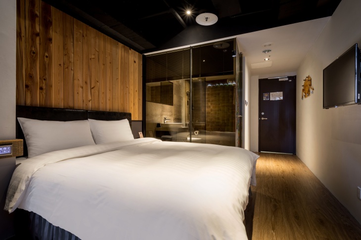 房型延續了大廳的潮流工業精神,巧妙運用粗獷的木質牆面、復古文化磚與深色系金屬元素,交織出極具層次感的都會氣息。房內皆利用溫暖的間接照明與現代感家具,中和了工業風的冷峻,營造出既前衛又舒壓的睡眠環境,衛浴空間同樣精彩,採用質感的六角花磚或深色石紋磚鋪陳,搭配透明玻璃隔間設計,增加視覺的通透感與現代美學。這裡的每一間房都像是一處城市裡的風格實驗室,讓您在探索完台中文藝景點後,能回到這座充滿質感的空間中,享受一段充滿生活美學的愜意時光。