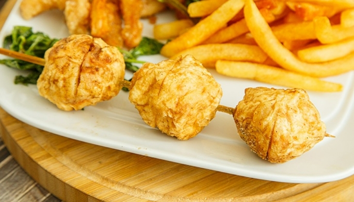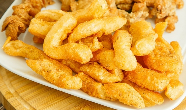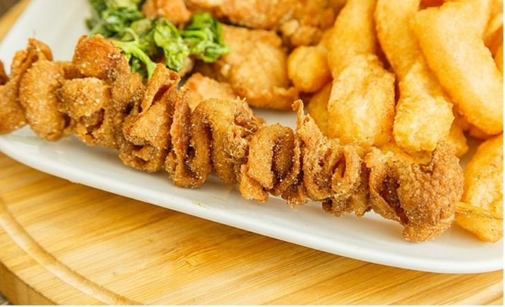這串銷魂脆口炸雞皮是懂吃老饕才會點的隱藏版主角。將雞皮整理成厚薄一致的片狀,先以香料醃製去腥增香,再裹上細緻粉漿,入油鍋炸到呈現迷人的焦糖色澤。一入口就能聽見清脆的喀嚓聲,酥到幾乎感受不到油膩感。雞皮本身的油脂在高溫中被逼出,只留下香濃卻不厚重的口感,小小一串,卻有讓人停不下來的魔力,是聚餐必點的罪惡小點。