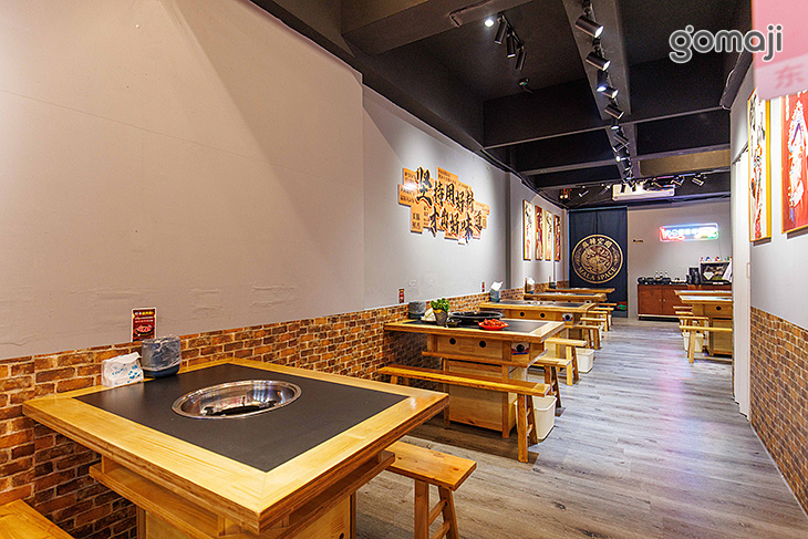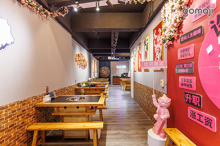 搭配溫潤木質桌椅,營造出輕鬆又帶點個性的用餐氛圍。牆面以灰色調為基底,點綴各式中式風格掛畫與裝飾,暖色燈光則讓整體空間更顯溫馨,低調中帶有文化韻味,呼應重慶老火鍋的傳統特色。開放式座位規劃寬敞不擁擠,搭配長板凳設計,特別適合三五好友或家庭聚餐,一起圍坐享受熱騰騰的鍋物時光。