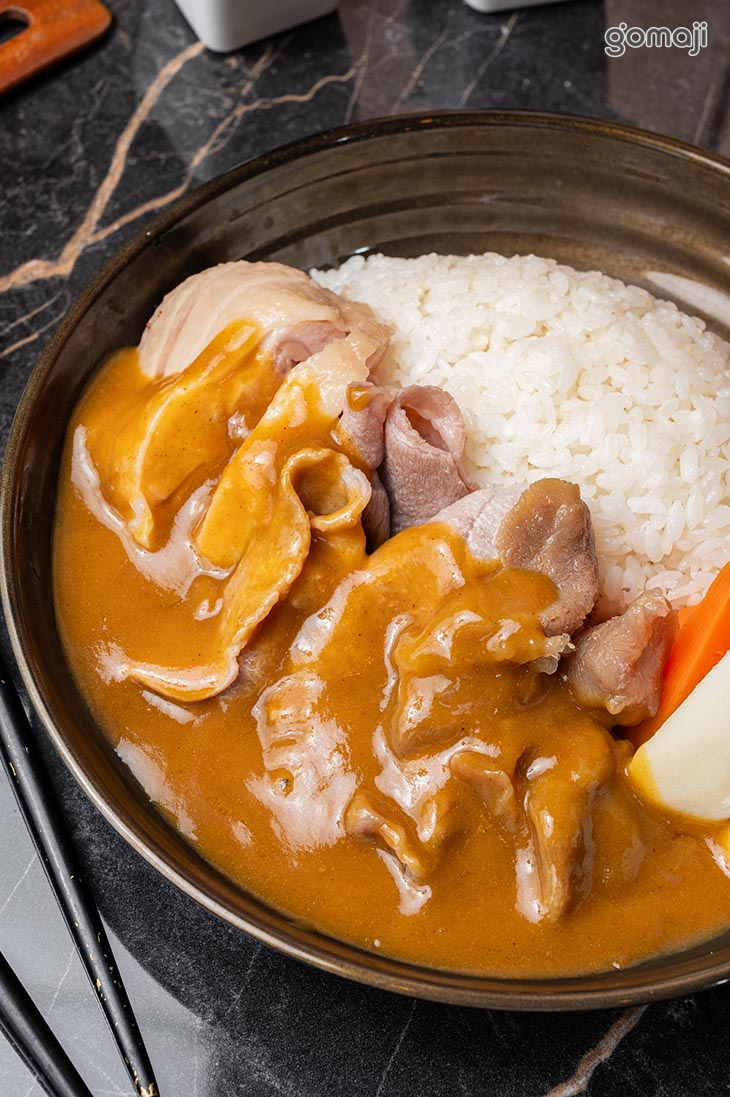咖哩三寶飯把雞、豬、牛一次集結,讓一盤咖哩飯多了更豐富的驚喜與滿足。白飯旁鋪上不同肉品,各自展現不同口感:雞肉細嫩柔和、豬肉帶點彈性與油香、牛肉則有更濃厚的肉味,三種風味在濃郁咖哩醬的包覆下,形成層次十足的組合。醬汁本身滑順濃厚,入口帶有溫和辛香與微甜尾韻,與肉香彼此襯托,讓整體吃起來格外順口。再搭配些許蔬菜,不只平衡味道,也讓視覺更顯豐富。對於選擇障礙的人來說,這道就像一次把喜歡的肉都端上桌,份量紮實、滋味飽滿,吃完特別有幸福感。