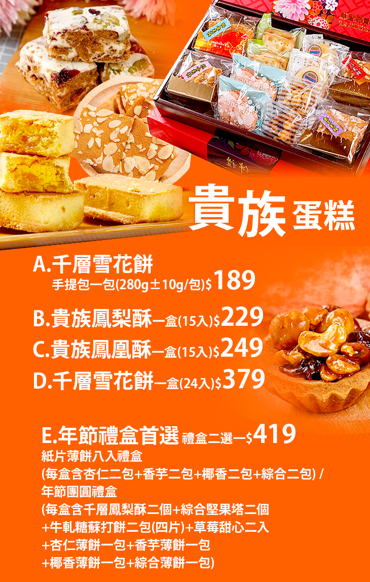 A.千層雪花餅手提包一包(280g±10g/包) / B.貴族鳳梨酥一盒(15入) / C.貴族鳳凰酥一盒(15入) / D.千層雪花餅一盒(24入) / E.年節禮盒首選