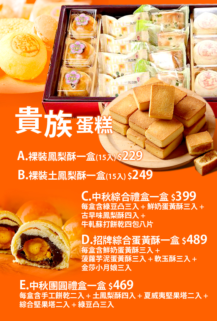 A.裸裝鳳梨酥一盒(15入) / B.裸裝土鳳梨酥一盒(15入) / C.中秋綜合禮盒一盒 / D.招牌綜合蛋黃酥一盒 / E.中秋團圓禮盒一盒