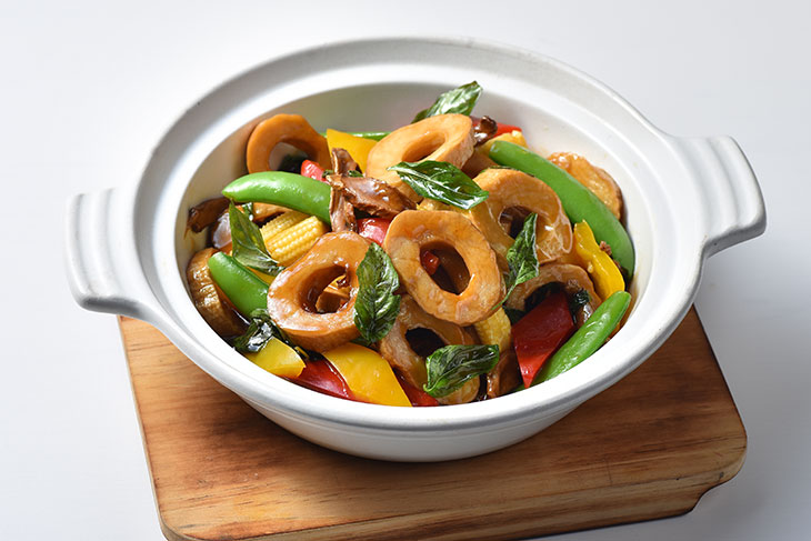 採用霸王級杏鮑菇搭配純正黑麻油、老薑片與主廚特調醬汁一起大火快炒,呈現三杯麻油中卷般的濃厚香氣與滋補風味。