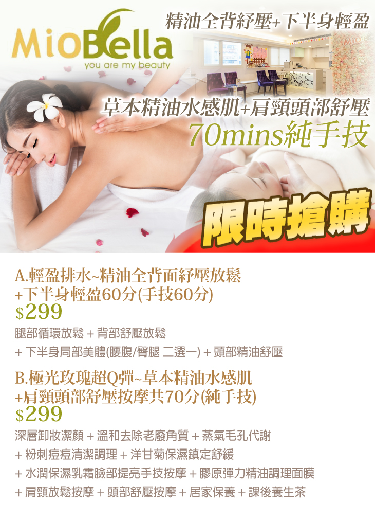 A.輕盈排水~精油全背面紓壓放鬆+下半身輕盈60分(手技60分) / B.極光玫瑰超Q彈~草本精油水感肌+肩頸頭部舒壓按摩共70分(純手技)