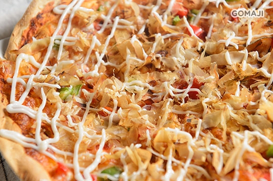 將披薩鋪上花枝,最上層以滿滿柴魚片提味,最後再淋上滑順的美乃滋,搭配帶著嚼勁的餅皮一同入口,花枝的鮮甜與起司的鹹香融為一體,美乃滋的甜香讓口感更加誘人滑順,美妙的口感彷彿在舌尖上起舞~