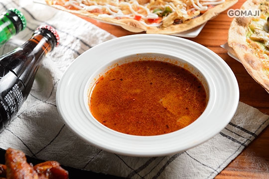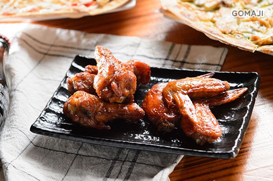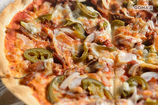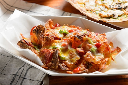 使用有雞玉米片,灑上碎青椒、紅椒、黑橄欖和起司後送進特製窯烤爐烘烤,風味絕佳!