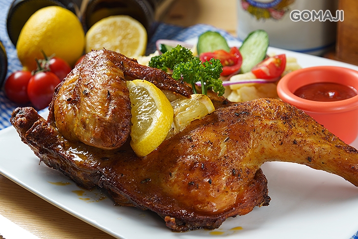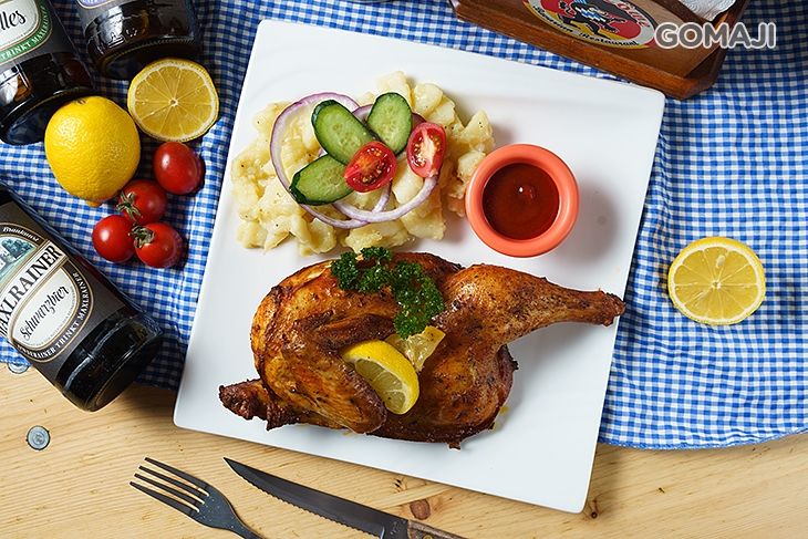 新鮮嫩美的雞隻,烹烤成油光閃閃、焦香誘人的烤半雞,豪邁地咬下那薄酥的雞皮,彈牙紮實的雞肉從中爆發豐盈馥郁的雞汁,盈滿齒唇的肉香甘甜,好吃到讓人忍不住大呼過癮!此時再配上一口鬆軟溼潤、風味醇厚的馬鈴薯沙拉,至高無上的美味席捲而來,讓人欲罷不能!