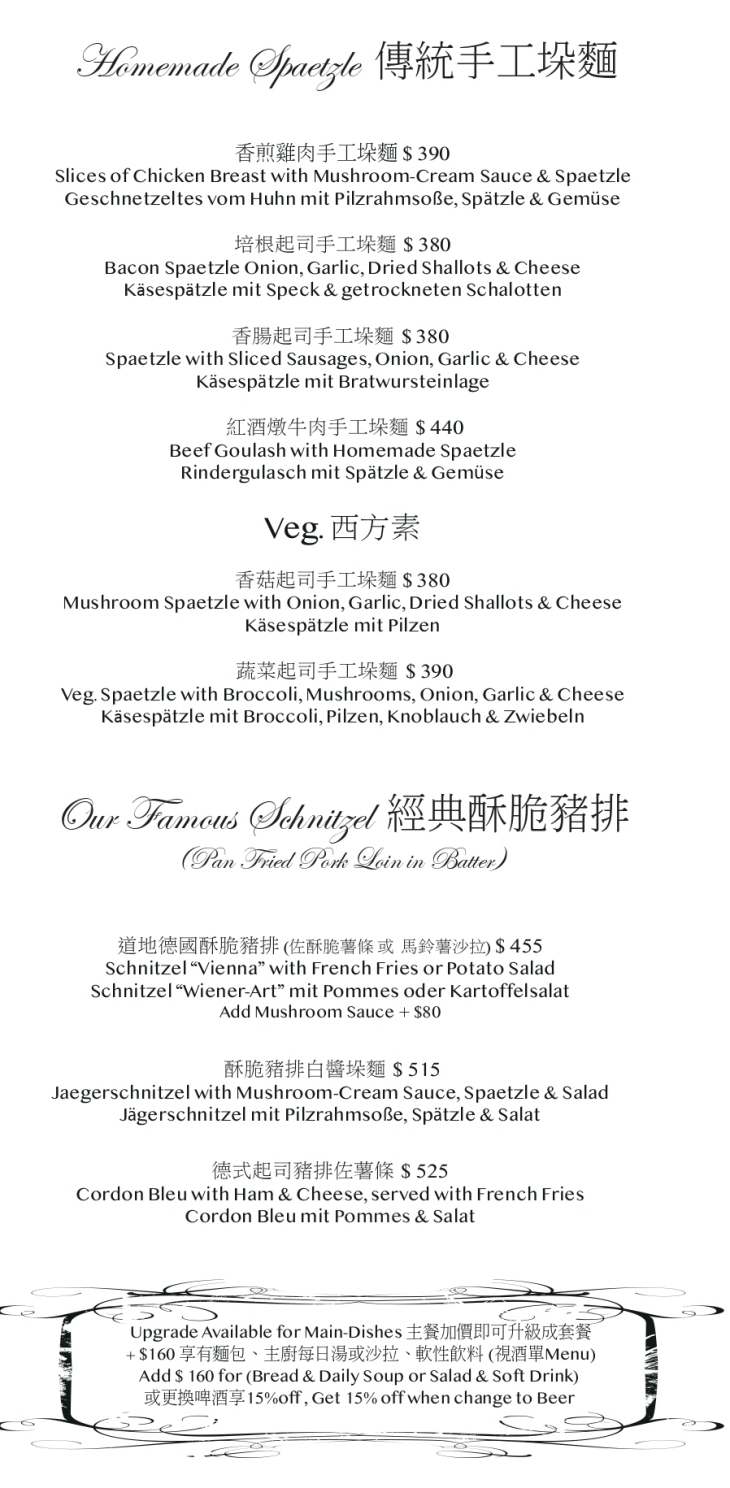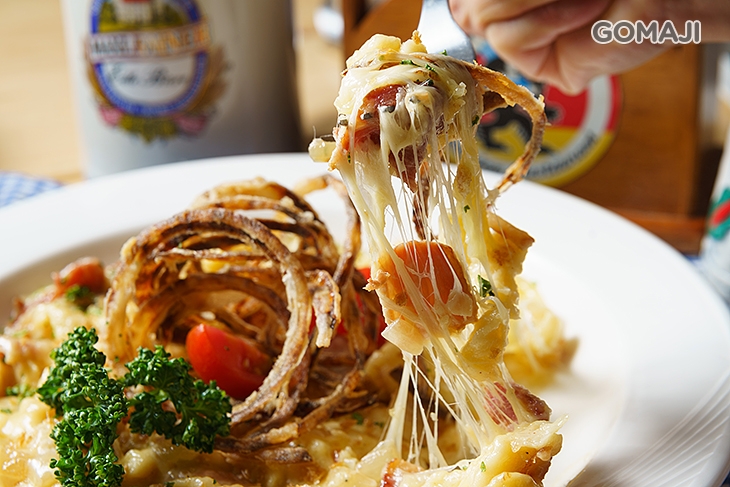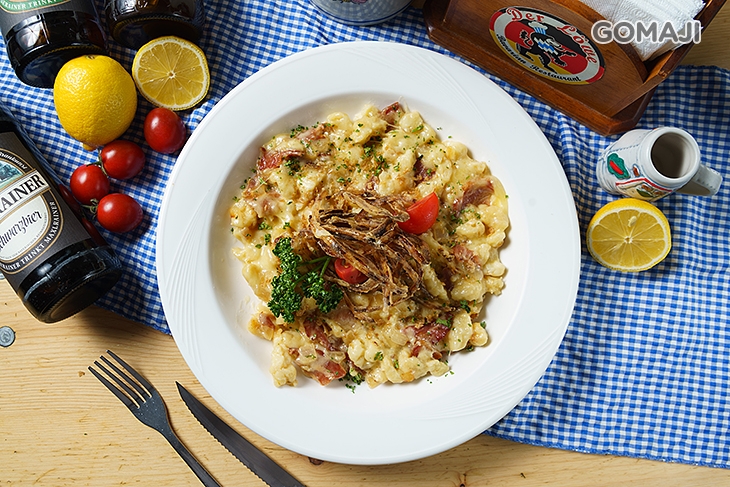 讓人意想不到的QQ口感,就是德式傳統垛麵的特色。純手工製作的垛麵,紮實的食感有著十足的咬勁,想品味正宗的德國料理,那就絕對不能錯過!加入起司、培根等香濃的食材配料,讓垛麵充滿濃郁的香氣,加上那嚼來彈性十足的感受,每一口都讓人超驚喜!一大盤份量十足,越吃越有勁!
