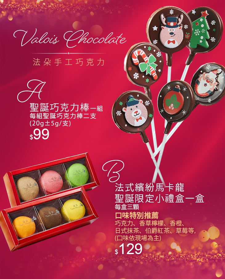 B . 法式繽紛馬卡龍聖誕限定小禮盒一盒 (每盒三顆,口味特別推薦:巧克力、香草檸檬、香橙、日式抹茶、伯爵紅茶、草莓等,口味依現場為主)