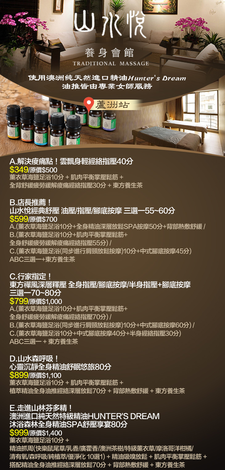 A.解決痠痛點!雲飄身輕經絡指壓40分 / B.店長推薦!山水悅經典舒壓 油壓/指壓/腳底按摩 三選一55~60分 / C.行家指定!東方禪風深層釋壓 全身指壓/腳底按摩/半身指壓+腳底按摩 三選一70~80分 / D.山水森呼吸!心靈沉靜全身精油舒眠悠旅80分 / E.走進山林芬多精!澳洲進口純天然特級精油Hunter's Dream沐浴森林全身精油spa舒壓享宴80分
