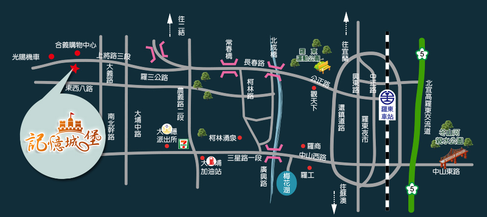 台北北宜公路→台九省道→羅東鎮右轉環鎮道路(純精路)→右轉羅東運動公園→直路公正路→過北成橋→接長春路→上將路三段→記憶城堡民宿