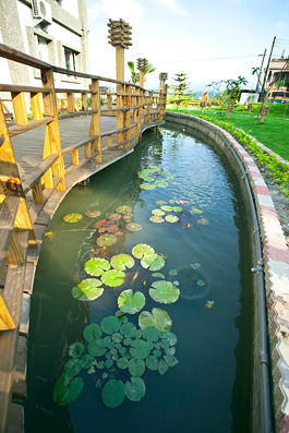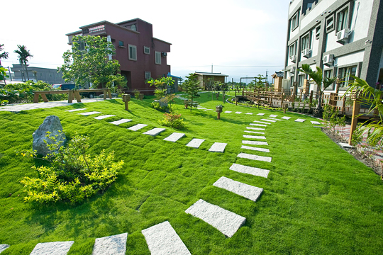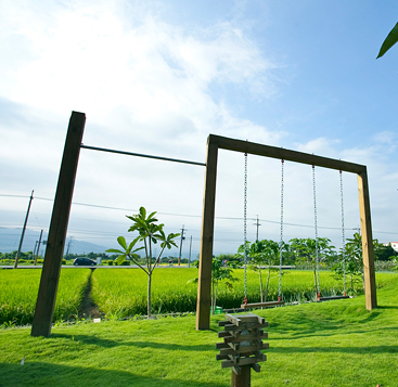 庭園的草坪則將田園的綠意延伸進民宿的範疇,手作的木製立燈如同衛兵般地一路恭迎您進入城堡;草坪上木製的蹺蹺板、盪鞦韆、戲水池等寬大腹地空間任您盡情玩耍遊憩!