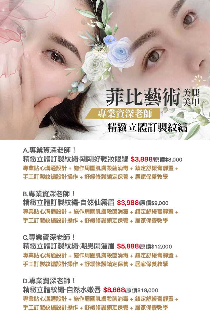 愛美,不分男女!【菲比藝術 美睫美甲】針對愛漂亮的女性及男性提供專業紋繡課程。專業的技術與美感,依照您的需求、五官搭配,設計出最適合您的紋繡造型。此外,所有課程皆使用品質優質的產品進行,就是要給您最高規格的服務!