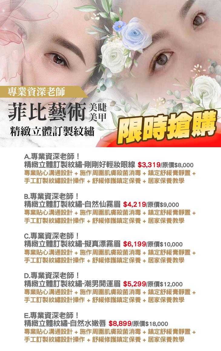 愛美,不分男女!【Phoebe 菲比沙龍】針對愛漂亮的女性及男性提供專業紋繡課程。專業的技術與美感,依照您的需求、五官搭配,設計出最適合您的紋繡造型。此外,所有課程皆使用品質優質的產品進行,就是要給您最高規格的服務!