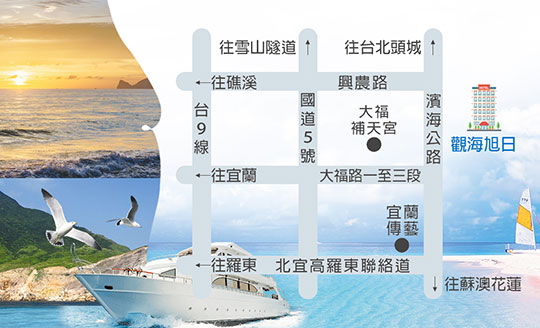 觀海旭日渡假中心位在太平洋沿岸,園區占地約2000坪,客房於2012年重新裝潢後,全部採防火建材建構,舒適寬敞、陽光飽足,從渡假中心散步至海邊,只要2分鐘,龜山島與藍天綠海,映入您眼簾的暢快,讓您心中也充滿了海洋風情~
