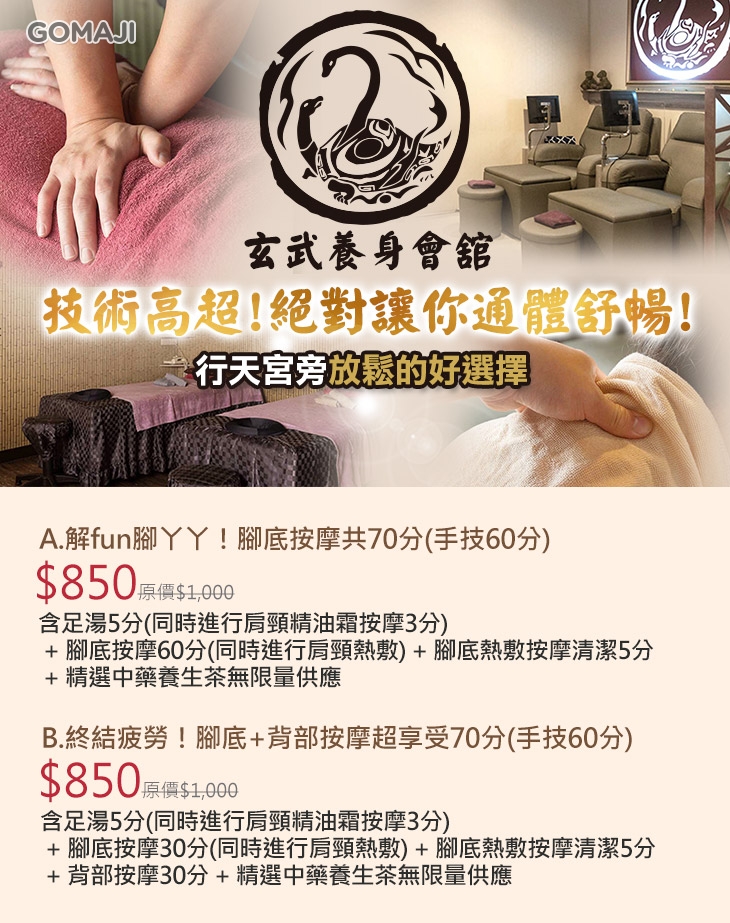 用心打造靜謐、典雅的空間,讓您有個能恣意放鬆身心的小天地!舒服的按摩手法絕對讓您整身又酥又放鬆,逃離平日上班的苦悶,不論是按摩師的精湛手技、親切態度,還是環境的舒適氛圍,都讓人好滿意!快來【玄武養身會舘】體驗看看~感受漫步於雲端的飄然自在吧!