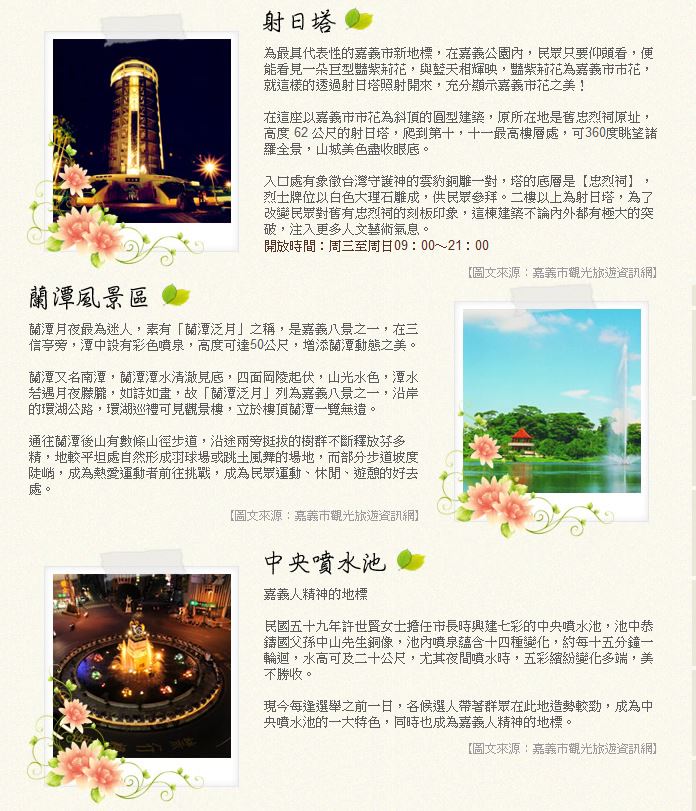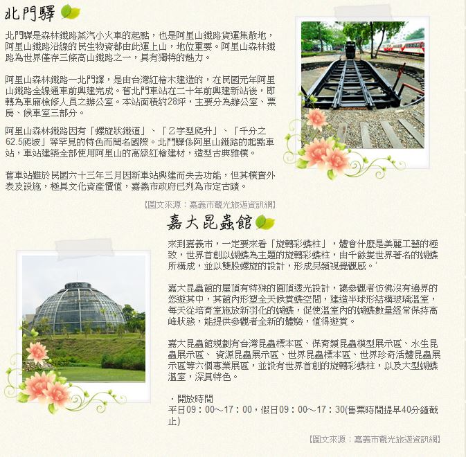 往東是鄒族原鄉阿里山,緊鄰玉山山脈,台灣第一景阿里山日出、擎天神木、森林鐵路、溪谷瀑布、原住民文化;往西是布袋、東石的蚵棚、鹽田漁港景致,沿海的 紅樹林保育區,豐富的鷺科水鳥與魚蟹生態,值得您探索其中;北回歸線地標北回太陽館、籌建中的故宮南院、百年寺廟古剎等,嘉義線儼然成為台灣旅遊必定造訪 與兼具知性、文化、藝術、休閒、觀光五大特色的縣市。 (※ 資料來源:嘉義縣文化觀光局 )