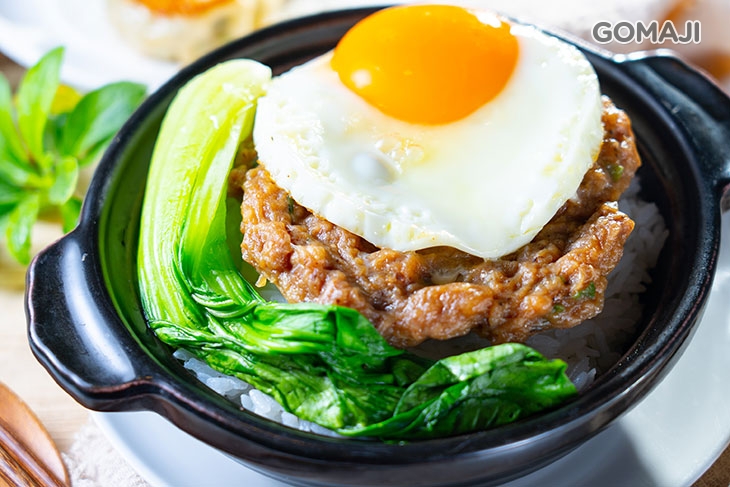 金黃細緻的滑蛋蓋在噴香誘人的牛肉蒸飯上,讓溫潤蛋黃流瀉而下,令牛肉增添滑順鮮美滋味,美味不膩口讓人吃過就愛上!