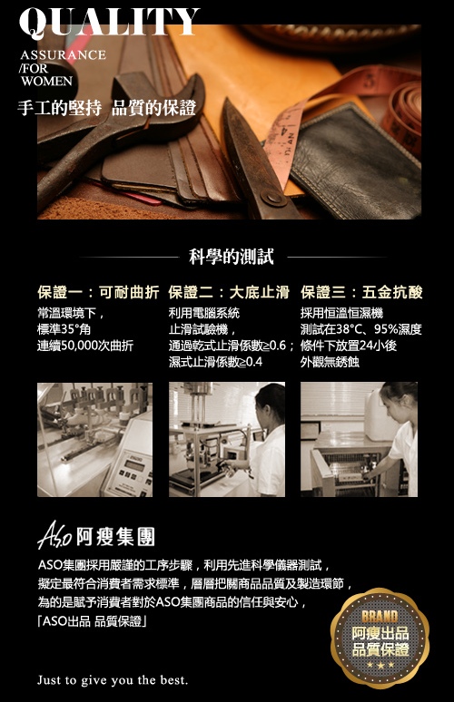六十年來堅持作台灣最好的鞋!在「一針一線、實實在在」的品質控管與堅持之下,獲國家獎項與消費者肯定,完美地融合優雅文化、質感與時尚!數十年來傳統精湛工藝在 阿瘦被保存下來,堅持品質為品牌承諾的長久之計,阿瘦皮鞋為每一雙鞋注入獨立的靈魂,成為超越時代的藝術!