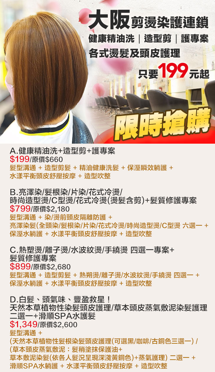 A.健康精油洗+造型剪+護專案 / B.亮澤染/髮根染/片染/花式冷燙/時尚造型燙/C型燙/花式冷燙(燙髮含剪)+髮質修護專案 / C.熱塑燙/離子燙/水波紋燙/手繞燙 四選一專案+髮質修護專案 / D.白髮、頭氣味、豐盈救星!天然本草植物性染髮頭皮護理/草本頭皮蒸氣敷泥染髮護理 二選一+滑順SPA水護髮