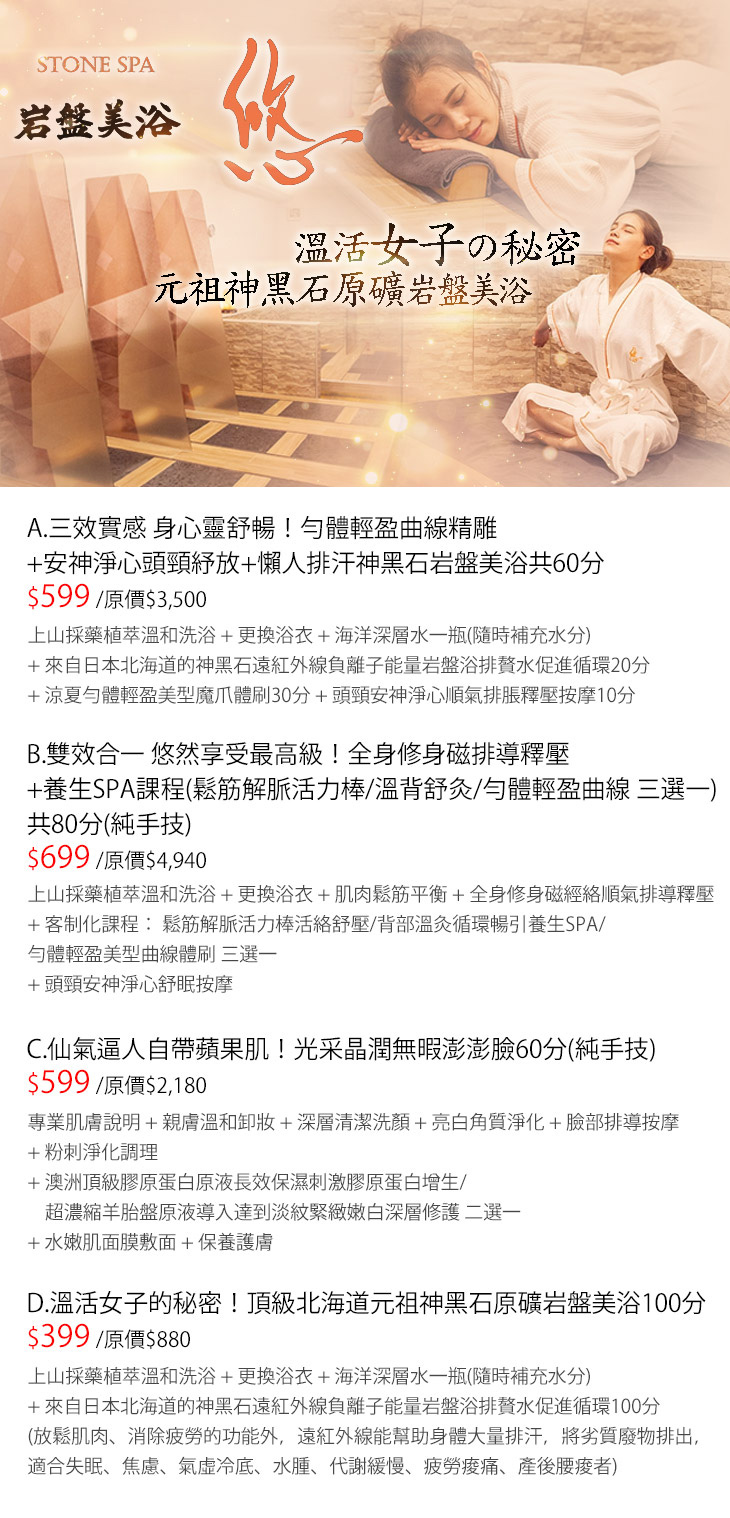 A.三效實感 身心靈舒暢!勻體輕盈曲線精雕+安神淨心頭頸紓放+懶人排汗神黑石岩盤美浴共60分 / B.雙效合一 悠然享受最高級!全身修身磁排導釋壓+養生SPA課程(鬆筋解脈活力棒/溫背舒灸/勻體輕盈曲線 三選一)共80分(純手技) / C.仙氣逼人自帶蘋果肌!光采晶潤無暇澎澎臉60分(純手技) / D.溫活女子的秘密!頂級北海道元祖神黑石原礦岩盤美浴100分