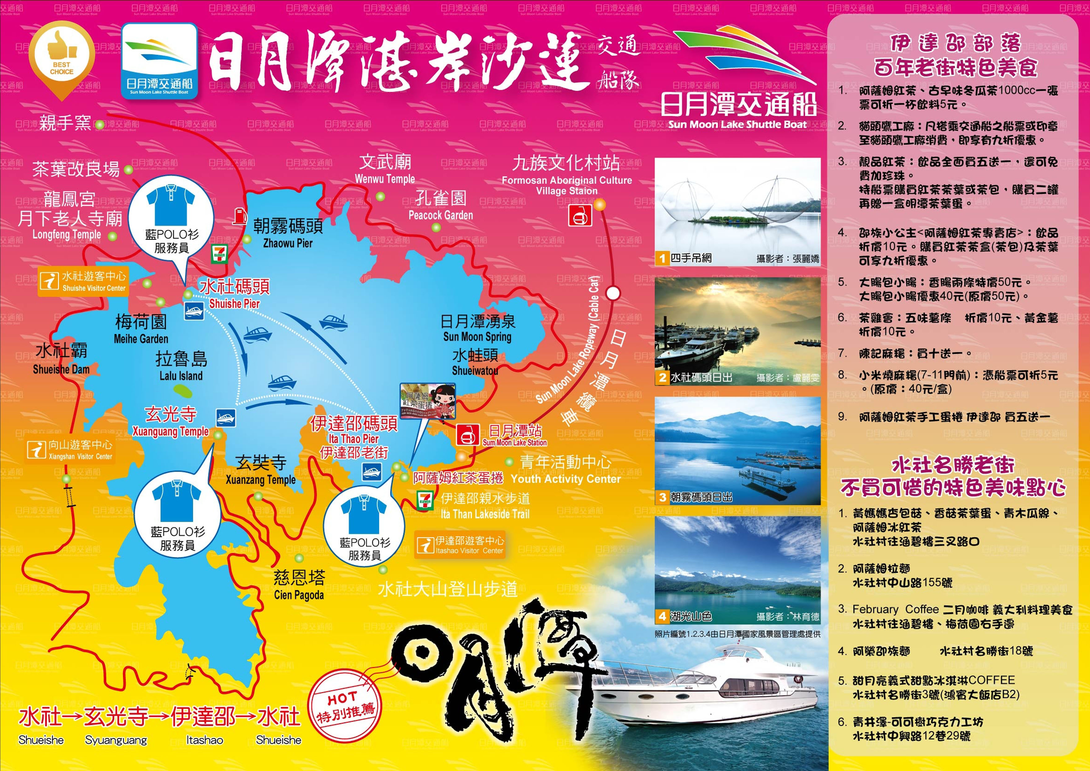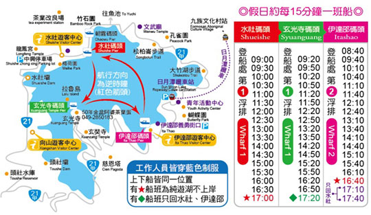 日月潭交通船旅遊網」主要航行路線為水社碼頭出發,分別停靠伊達邵碼頭、玄光寺碼頭,「定時出航、自由搭配、自行車ok」等服務特色,船隊在日月潭三大碼頭均配置專業親切的服務人員,引導乘客安全的上下船,服務人員約40人以上,安心可靠。