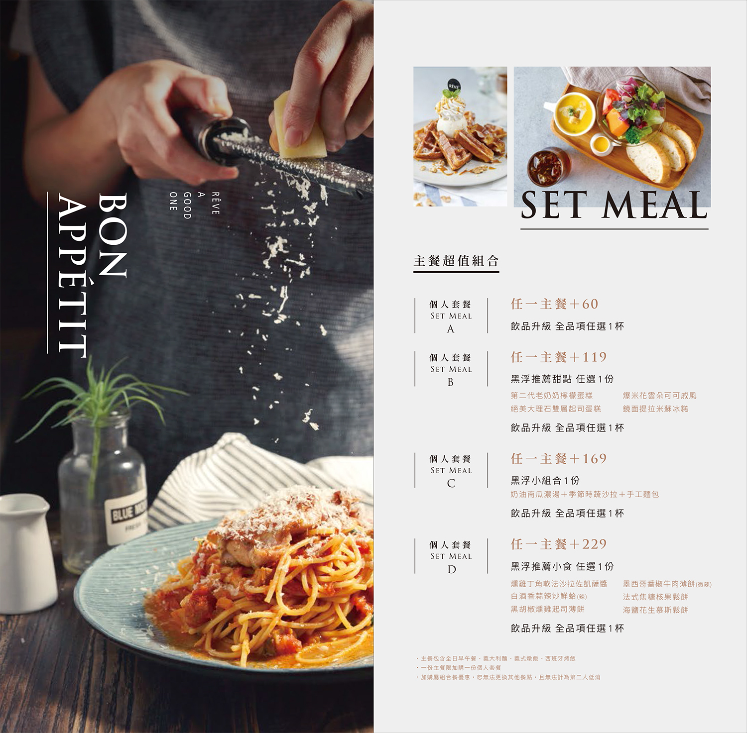 『有餐的好咖啡館,有好咖啡的餐館』,一個簡單的想法,【RÊVE Café 黑浮咖啡】堅持新鮮烘焙、餐點現點現做,用美食分享品味及生活態度,演繹這名為「夢想」的故事。選一個舒適座位,點一份咖啡美食,黑浮咖啡提供早午餐、義大利麵、手沖咖啡等,給您最美好的晨間午後饗宴。