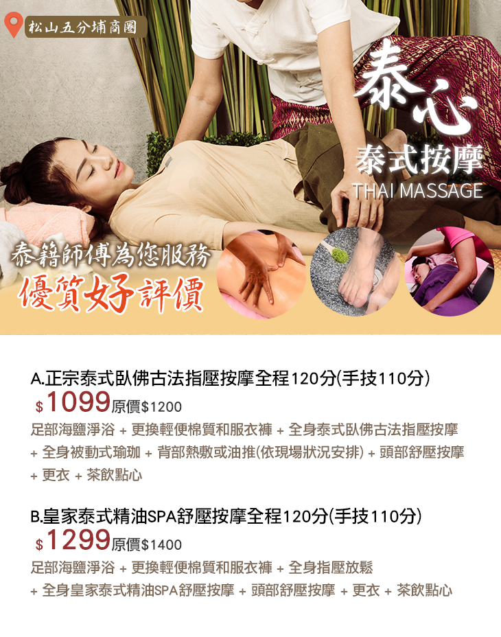 A.正宗泰式臥佛古法指壓按摩全程120分(手技110分) / B.皇家泰式精油SPA舒壓按摩全程120分(手技110分)