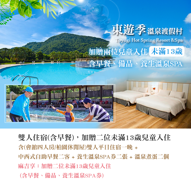 ➯ 麻吉享:加贈二位未滿13歲兒童入住(含早餐、備品、養生溫泉SPA券)!