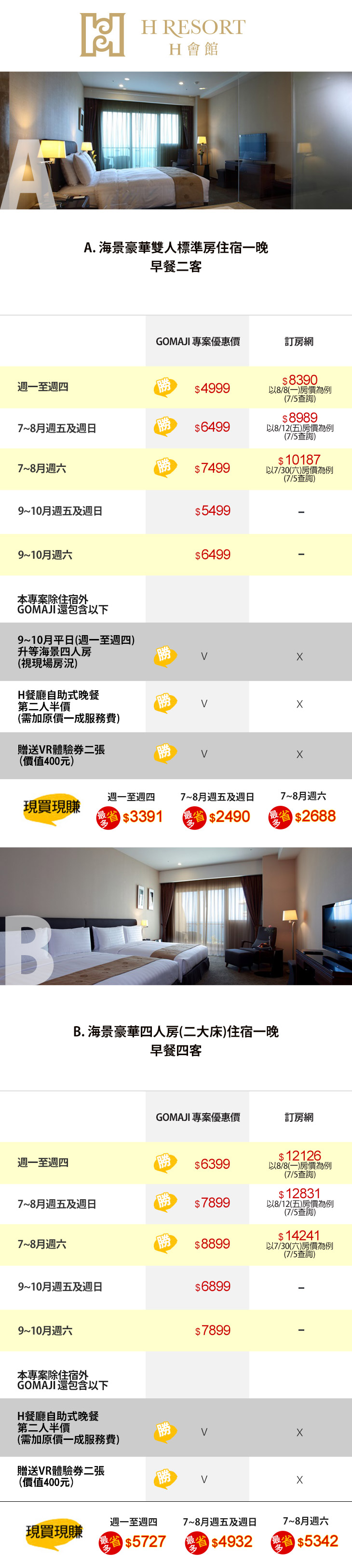 ★ AB方案享麻吉好康:1.H餐廳自助式晚餐第二人半價(需加原價一成服務費)、2.贈送VR體驗券二張(價值400元)!