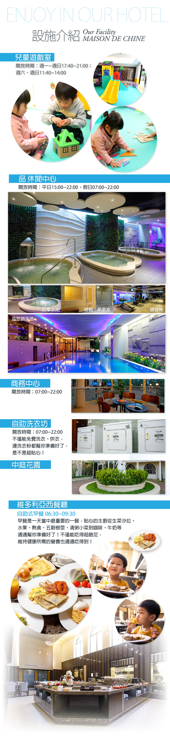 ● 品休閒中心開放時間:週日至週五 15:00~22:00,週六至週日 07:00~22:00