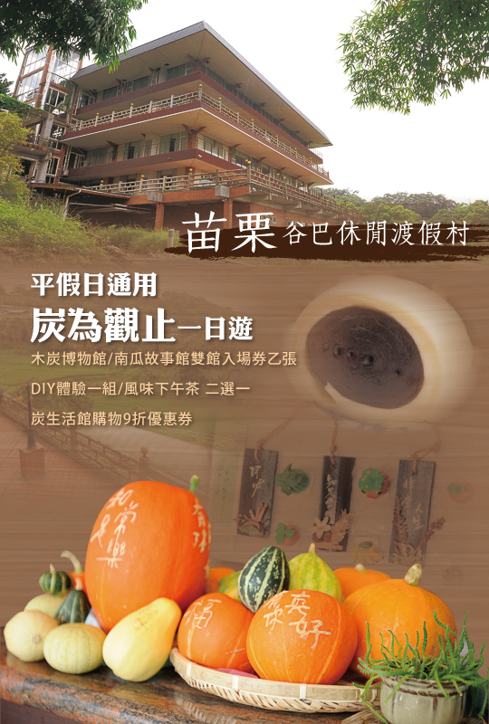 位在苗栗造橋的谷巴休閒渡假村,是全國唯一以木炭為主題的渡假村,全區佔地三萬坪,在食宿和休閒觀光方面,融合了造橋當地的木炭資源和客家文化,還有周圍環繞的綠意美景,希望為您創造出不同凡響的休閒渡假體驗。