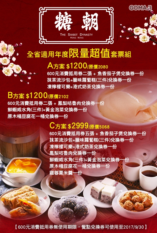 豆花百花宴、湘蓮子芝麻糊、椰汁香芋紫米露、鮮果凍豆腐花、綜合鮮果雪糕、鮮雜果西米露、豆腐花紅豆沙、熱山水豆腐花、芒果珍珠凍豆腐花、鮮芒果凍布甸、楊 枝甘露雪糕、原木桶豆腐花、芝麻湯圓紫米露、湘蓮子鮮紅棗燉雪蛤膏、糖朝極品官燕燉鮮杏仁露、糖朝極品官燕燉鮮芝麻糊、糖朝極品官燕燉鮮核桃露