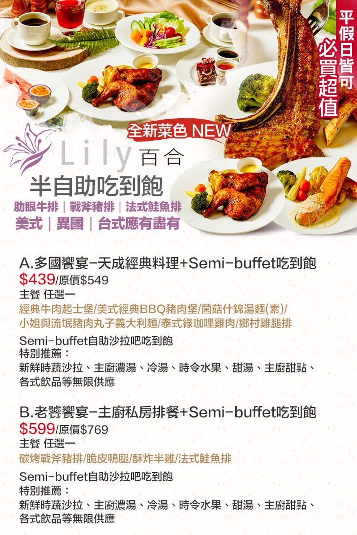 ※ Semi-buffet 菜色內容依季節時令調整,實際菜色、價目依現場提供為主。