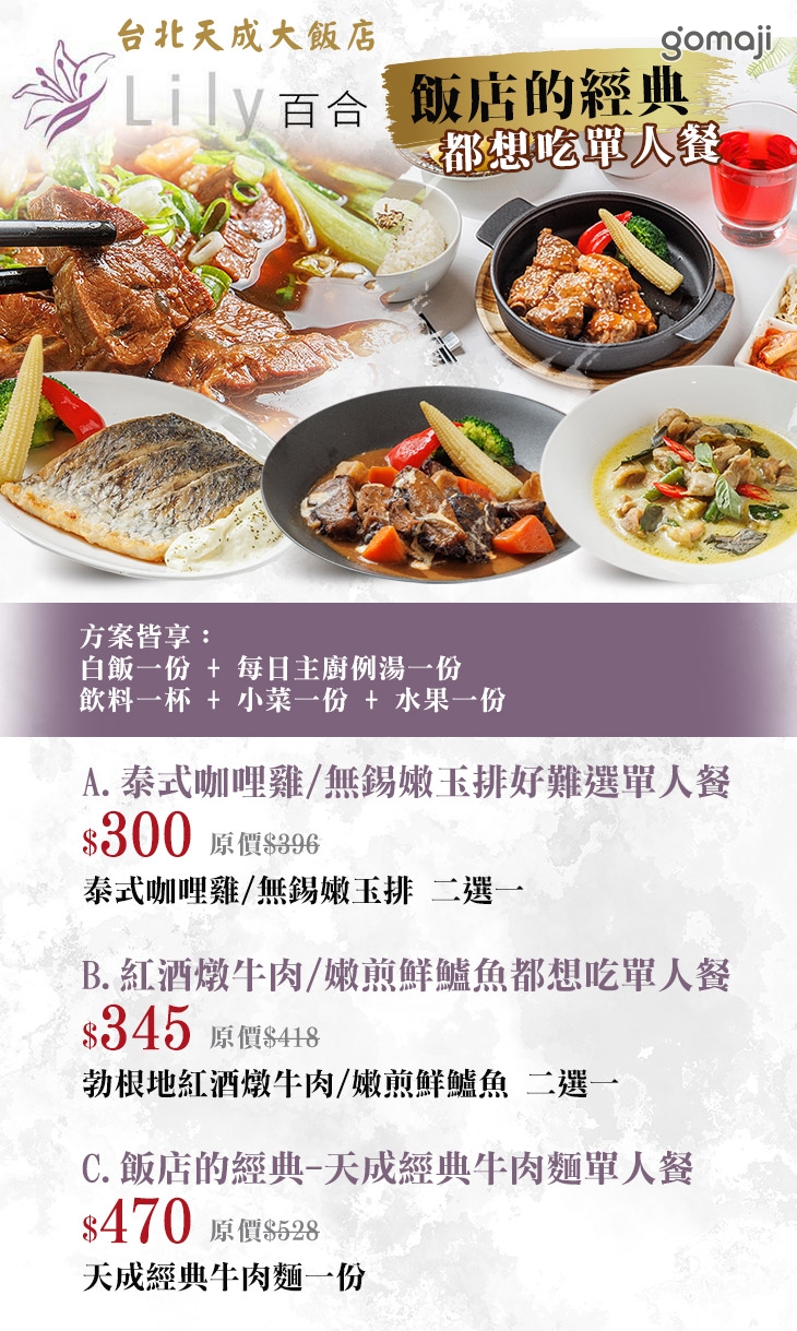 A.泰式咖哩雞/無錫嫩玉排好難選單人餐 / B.紅酒燉牛肉/嫩煎鮮鱸魚都想吃單人餐 / C.飯店的經典-天成經典牛肉麵單人餐